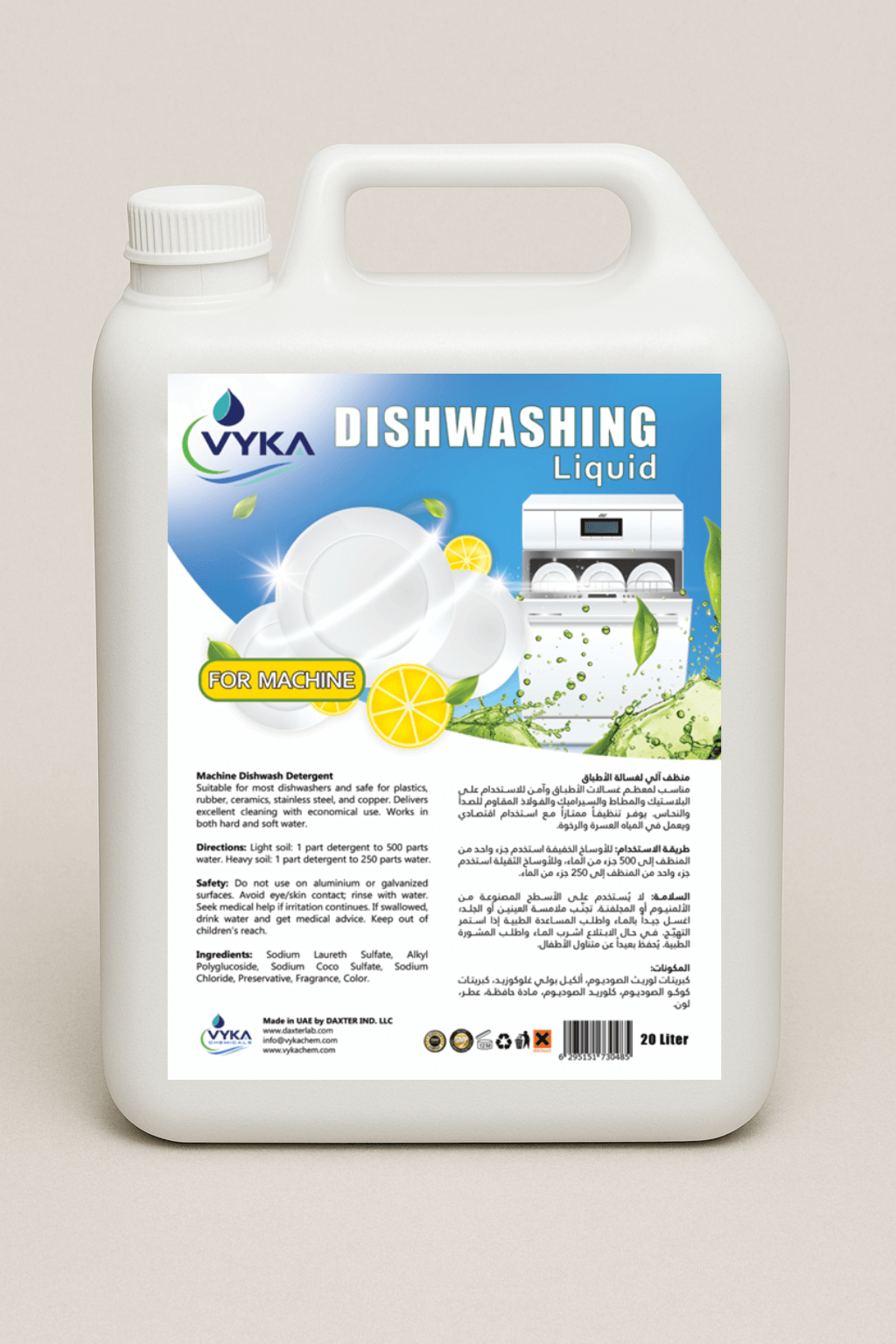 VYKA Dishwashing Liquid (Machine Use) is supplied in 20-liter high-durability containers, designed for professional handling, bulk usage, and compatibility with dosing systems.