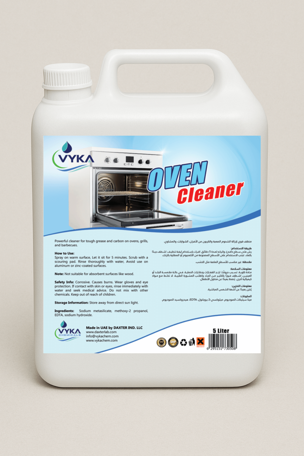 VYKA Oven Cleaner is a heavy-duty, high-performance formulation designed to effectively remove carbonized grease, stubborn food residues, and baked-on deposits. Developed through controlled manufacturing processes, it delivers deep-penetrating cleaning action that restores cooking equipment to high hygiene standards. Its fast-acting composition reduces manual scrubbing while ensuring consistent and reliable results, making it suitable for professional and high-demand kitchen environments.